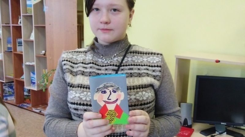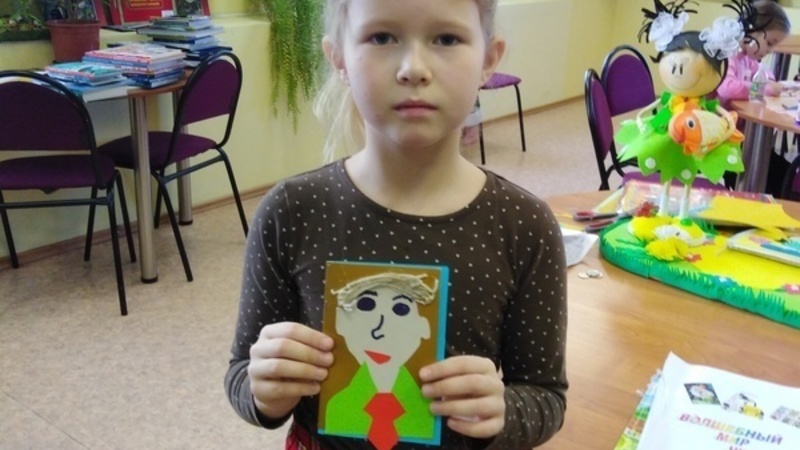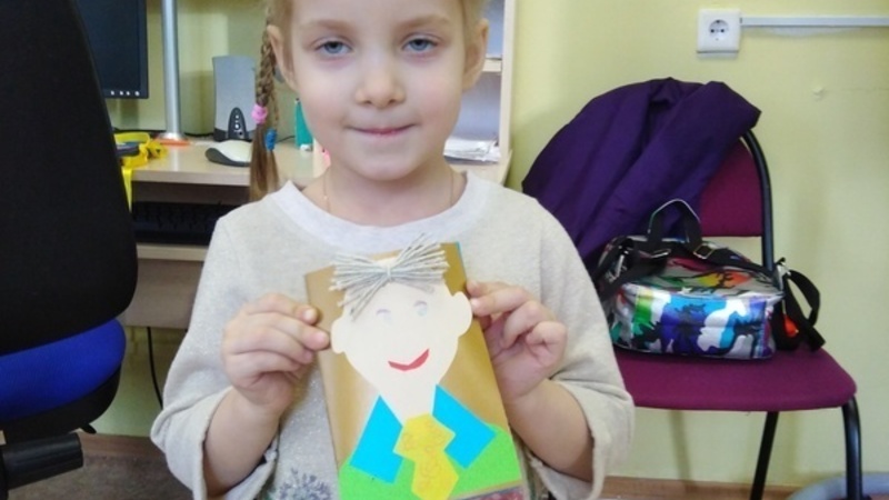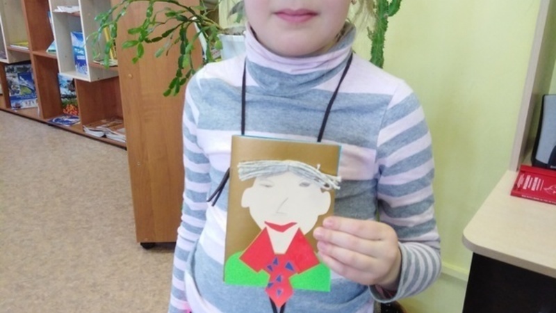 Обложку ребята оформили аппликацией в виде мужского лица с причёской из ниток для вязания. Глаза, нос и брови дети нарисовали карандашами и фломастерами, а рубашку и галстук сделали из цветной бумаги.