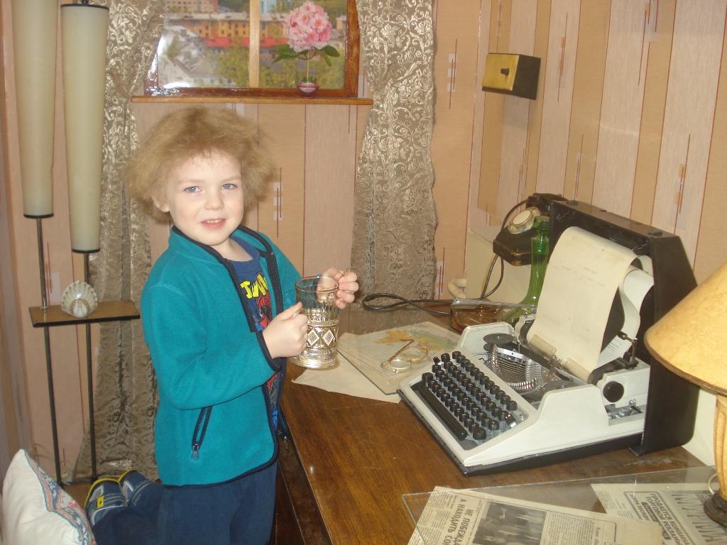 Маленькие посетители с удовольствием рассматривали экспонаты музея, заглядывали в писательский портфель для рукописей, трогали «стакан настоящего писателя», изучали газеты тридцатилетней давности.