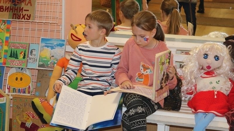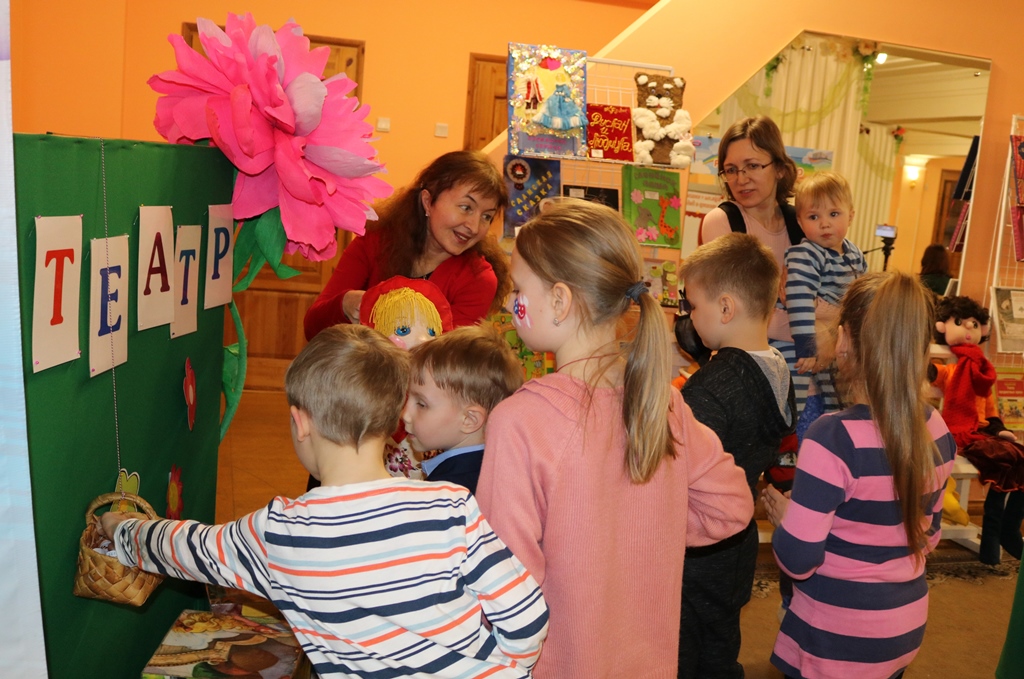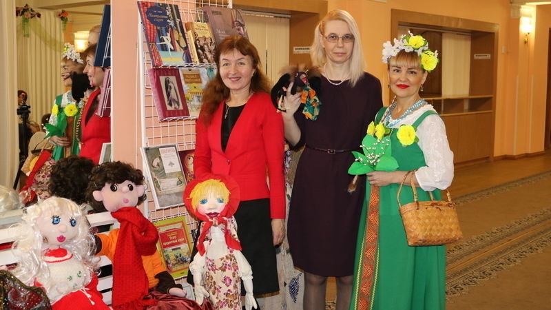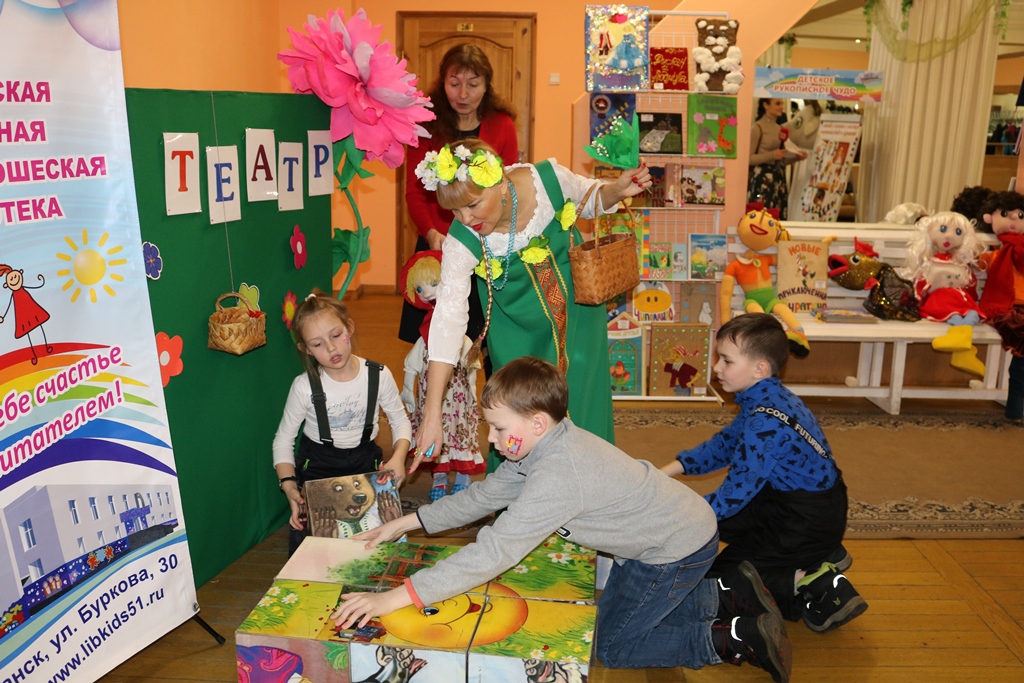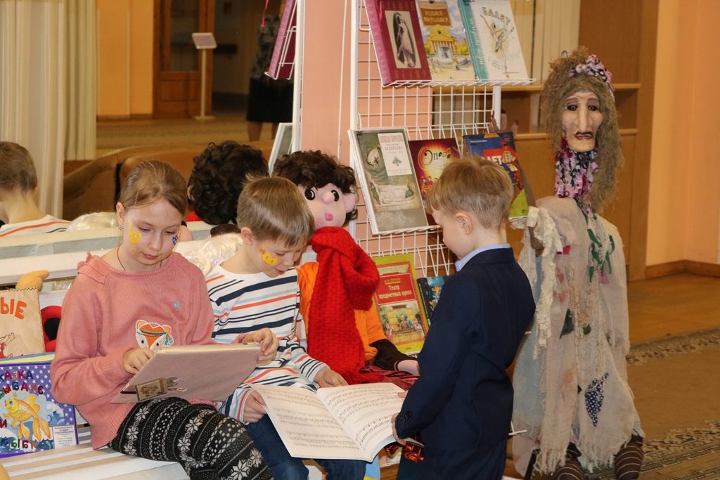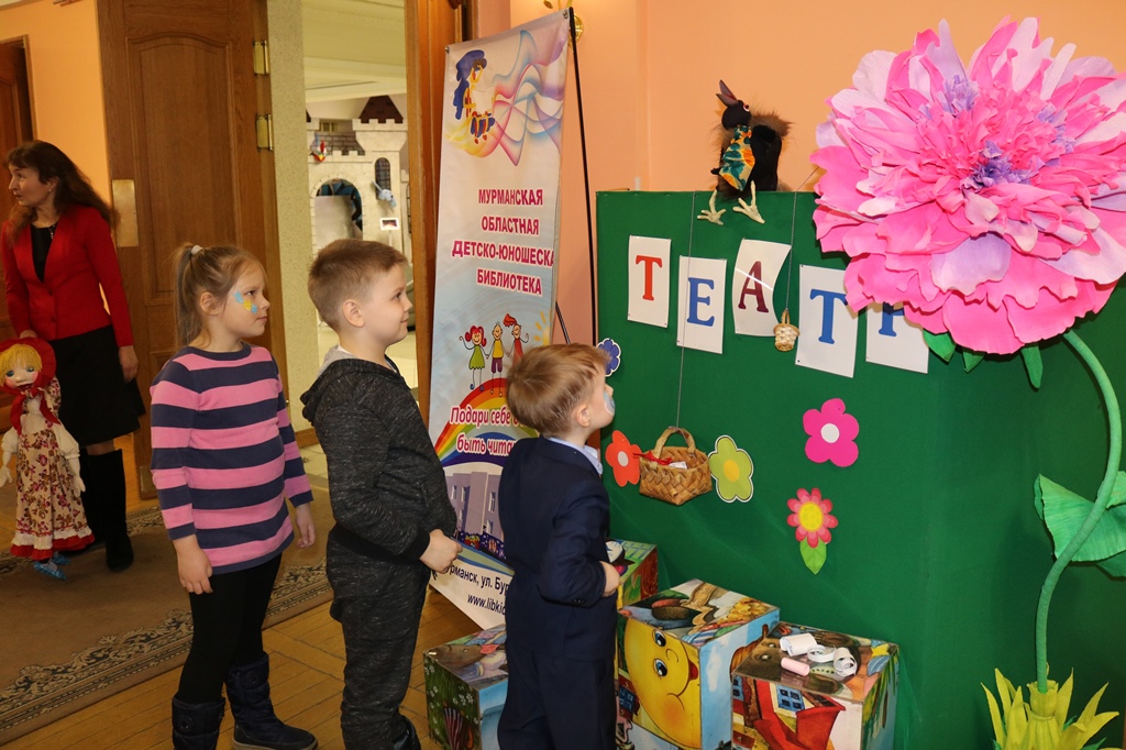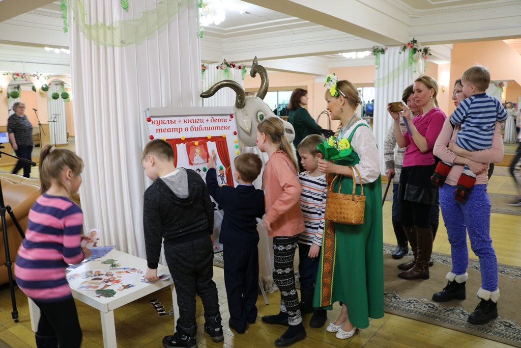В сказочном уголке, оборудованном сотрудниками библиотеки, посетителей дворца встречали герои детских книг: Весна-красна, театральные куклы Маша и Ворона. Взрослые и дети знакомились с книгами по истории театра и с детскими рукописными книгами по любимым сказкам, представленными на выставке «Детское рукописное чудо».