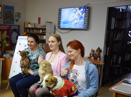 Библиосумерки не прошли без участия хвостатых друзей библиотеки – в гости пришли собаки и кинологи из клуба «Романов на Мурмане», участники проекта «Книжный пес». Библиотекарь познакомил ребят с книгой на английском языке про бабочку Алину и ее друзей. Дети выучили новые слова, перевели предложения и почитали книгу вслух. Собаки внимательно слушали, подбадривая юных читателей. После прочтения у всех была возможность пообщаться с книжными песиками.