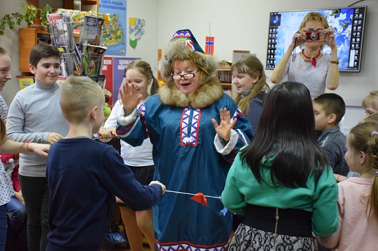 Дружный саамский хоровод собрал друзей библиотеки – учеников школы №13 в секторе литературы на иностранных языках. Дети показали театрализацию на английском языке «Северный танец». На страноведческий праздник пришла Татьяна Яшинькина, представитель Мурманского отделения Генерального консульства Финляндии в Санкт-Петербурге. Она рассказала о финских саамах, саамской одежде и культуре. А библиотекари провели активные веселые игры, в которых гости с удовольствием приняли участие. Встреча закончилась проведением мастер-класса по рисованию саамского костюма.