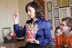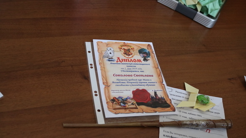 В заключение директор школы магов и волшебников вручила детям диплом об окончании пробного курса, значок с эмблемой школы, карамельных лягушек и самое главное, каждый получил "волшебную палочку".