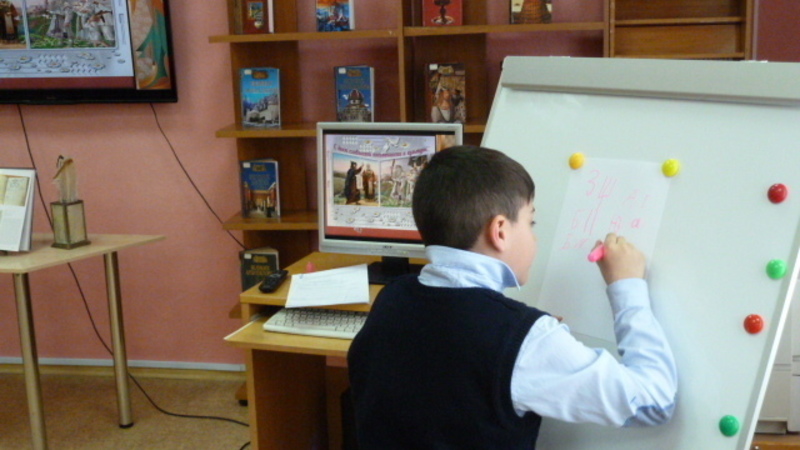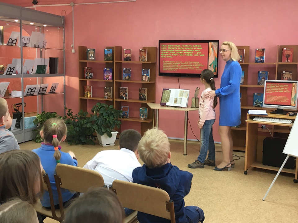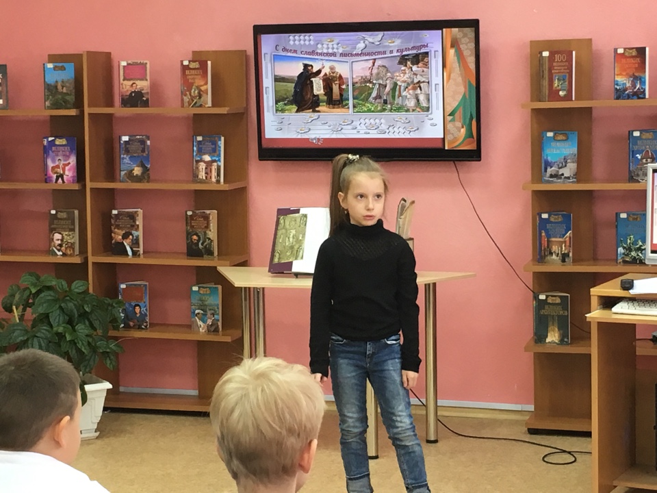 На мероприятие были приглашены учащиеся 2 «А» и «Б» классов средней общеобразовательной школы № 53. Дети познакомились с историей праздника, который отмечается во всех славянских странах, узнали имена создателей азбуки, где и когда был установлен памятник Кириллу и Мефодию в Мурманске, вспомнили, чем писали сто лет назад.
