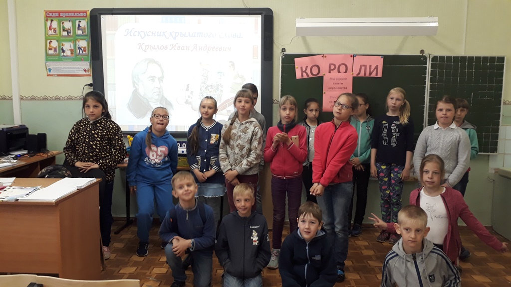 Ребята узнали много интересных фактов из биографии великого баснописца. Отвечая на вопросы викторины, дети вспомнили знаменитые басни и их героев. Школьники посмотрели фрагменты мультфильмов, снятых по мотивам произведений И. А. Крылова. Дети угадывали предметы из басен, собирали крылатые выражения, соотносили черты характера с персонажами.