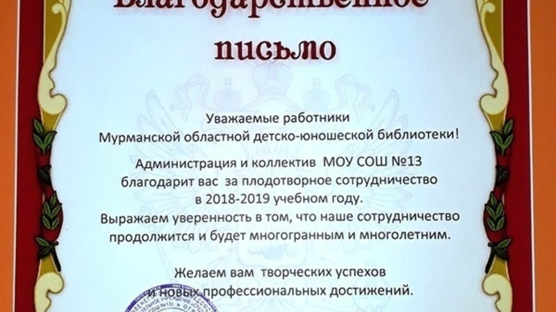Администрация средней общеобразовательной школы №13 поселка Высокий вручила коллективу библиотеки благодарственное письмо за плодотворное сотрудничество в 2018-2019 учебном году!