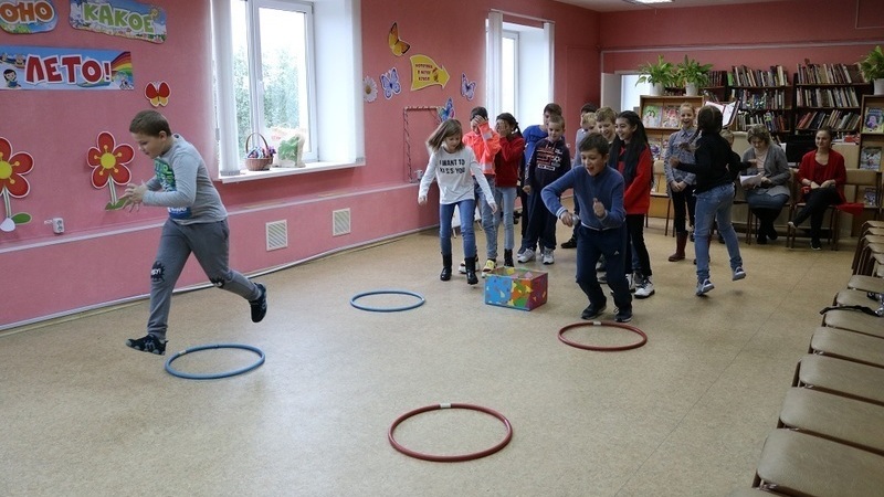 Погода внесла свои коррективы – пронизывающий северный ветер с дождем напомнил всем, что лето в Мурманске суровое и не предполагает развлечений на улице. Поэтому ребята летнего лагеря школы №49 сразу прошли в отделы библиотеки, где их уже ждали подвижные игры (чтобы согреться!),