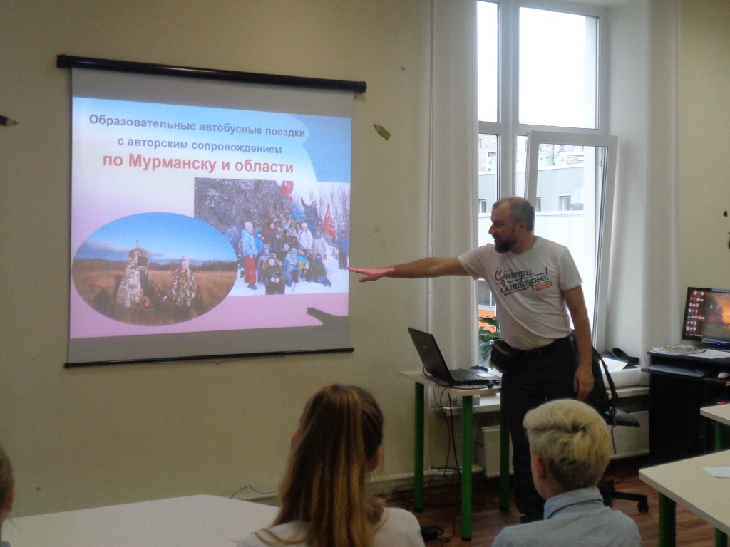 На встречу с ребятами пришел Згазинский Сергей Михайлович, сотрудник Центра содействия развитию гуманитарных наук, образования и культуры «Мыслеобраз». Организатор туристических походов по Мурманской области рассказал об особенностях подготовки туристов.