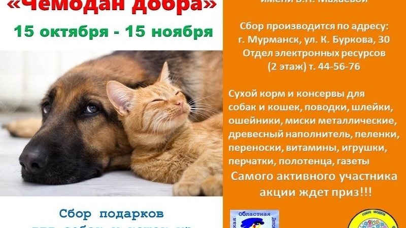 Основная цель – собрать как можно больше корма и других нужностей пушистым обитателям приюта для бездомных животных. Принимается любой корм: для собак и кошек, щенков и котят, влажный и сухой. В любом количестве! Кроме того, хвостики будут безмерно рады игрушкам, одноразовым пеленкам, средствам по уходу за животными. Акция продлится до 15 ноября. «Чемодан добра» ждет вас в отделе электронных ресурсов (2 этаж) в часы работы библиотеки. Самый активный участник акции получит приз!