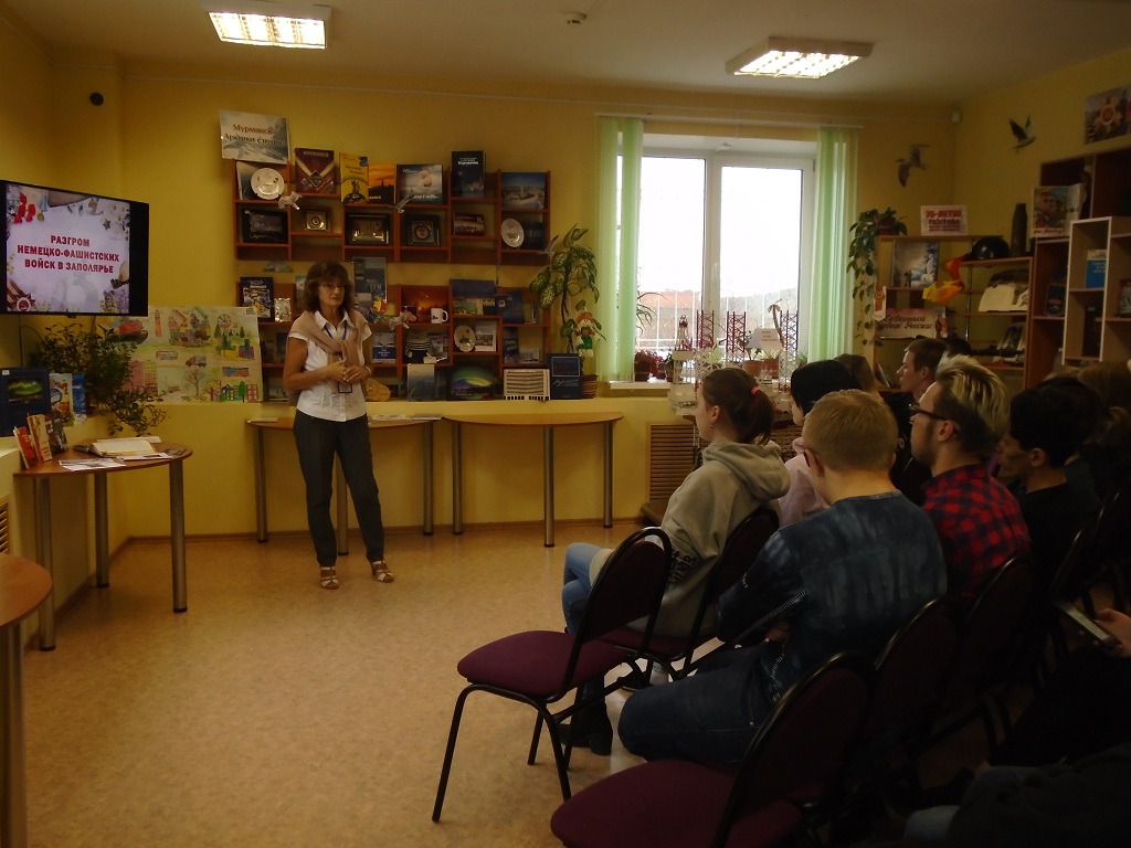 Студенты узнали о ходе военных действий в Заполярье и Петсамо-Киркенесской операции. Затем познакомились с трагической статистикой войны и узнали о героях, защищавших Кольский полуостров на земле, в воздухе и на море. Речь шла о подвиге адмирала Н. Кузнецова, боевых рейдах подводников М. Гаджиева, И. Фисановича, А. Каутского, морского пехотинца–десантника В. Кислякова, командира специального разведывательно-диверсионного отряда В. Леонова, легендарного летчика-истребителя Б. Сафонова. Студенты узнали новые факты о войне в Заполярье. Рассказ сопровождался демонстрацией документальных фотографий и кинохроники военных действий в Заполярье, звучали песни «Прощайте, скалистые горы…» и «Солдаты Карельского фронта».