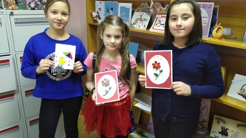 Дети выполняли открытку «Аленький цветочек» и картину «Утенок под зонтом» в технике квиллинг. Юные рукодельницы только начинают осваивать технику квиллинг и выполняют пока несложные работы.