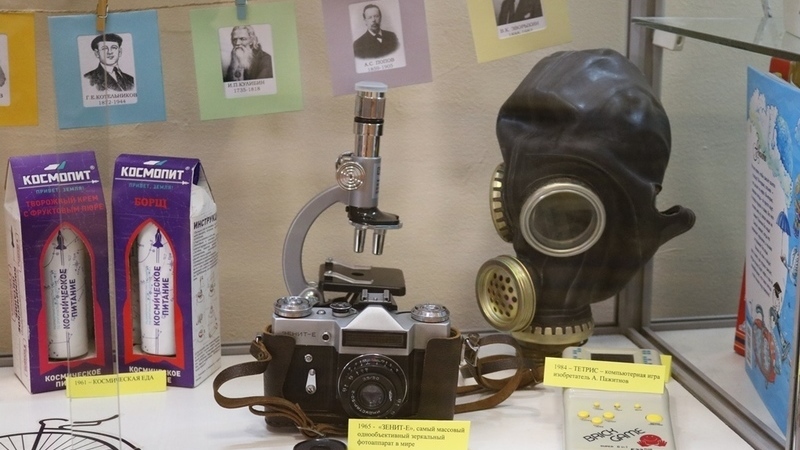 На выставке демонстрируются некоторые предметы, созданные в разные периоды времени российскими изобретателями: радиоприемник, противогаз, микроскоп, лампочка, тетрис, космическое питание, фотоаппарат «Зенит», простой арифметический инструмент – счёты, макеты ледокола «Арктика», вертолета, танка Т-34.