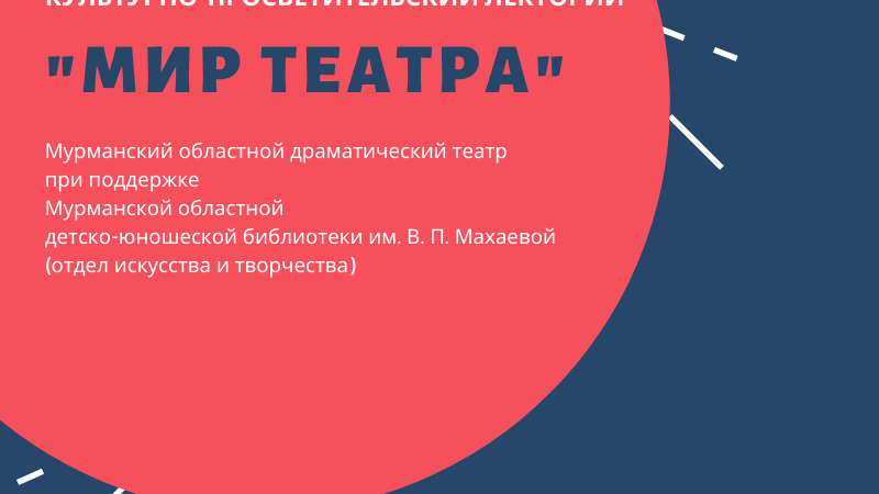 Культурно-просветительский лекторий «Мир театра» приглашает всех желающих на цикл занятий, которые будут проходить в отделе литературы по искусству с первой недели ноября до конца мая. Лекторы — мурманские филологи, журналисты и театральные деятели.