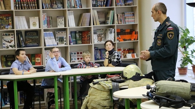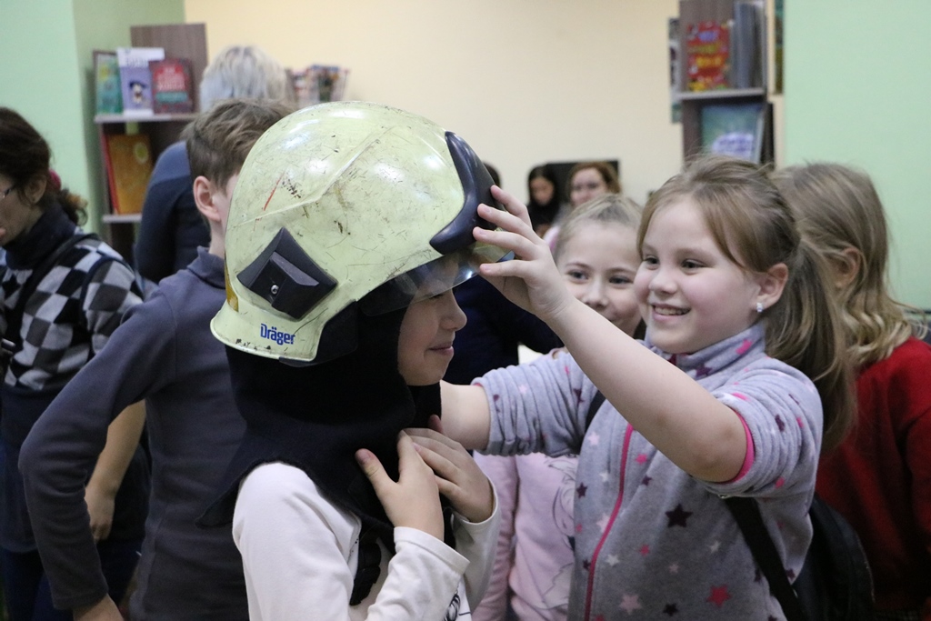 Сотрудник МЧС показывал настоящий костюм и снаряжение пожарного и рассказывал о пожарной безопасности, а дети смогли все потрогать и примерить.