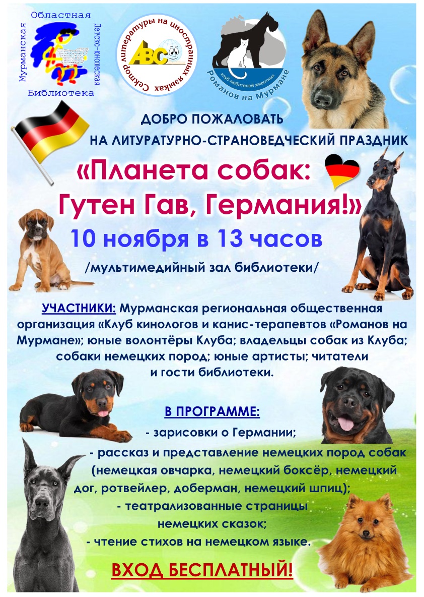 Главные артисты праздника – это члены клуба кинологов и канистерапевтов «Романов на Мурмане» со своими четвероногими питомцами. Владельцы представят своих собак немецких пород и расскажут о них. Гости праздника смогут насладиться театрализованными страницами немецких сказок в исполнении лохматых артистов, а также услышат стихи на немецком языке в исполнении читателей библиотеки и познакомятся с символами Германии.
