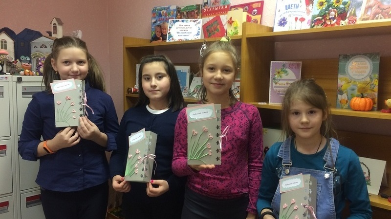 Дети сделали поздравительную открытку и цветы в технике квиллинг.