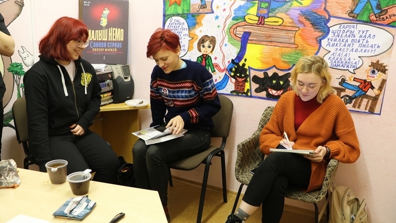 По ходу встречи гости задавали вопросы, связанные с творчеством художницы и объединения GАРАЖ, спрашивали, какие функции выполняет каждый участник, какие полезные и вредные привычки имеют, интересовались планами на будущее, связанными с изданием комиксов.