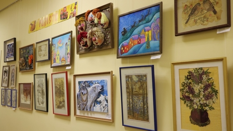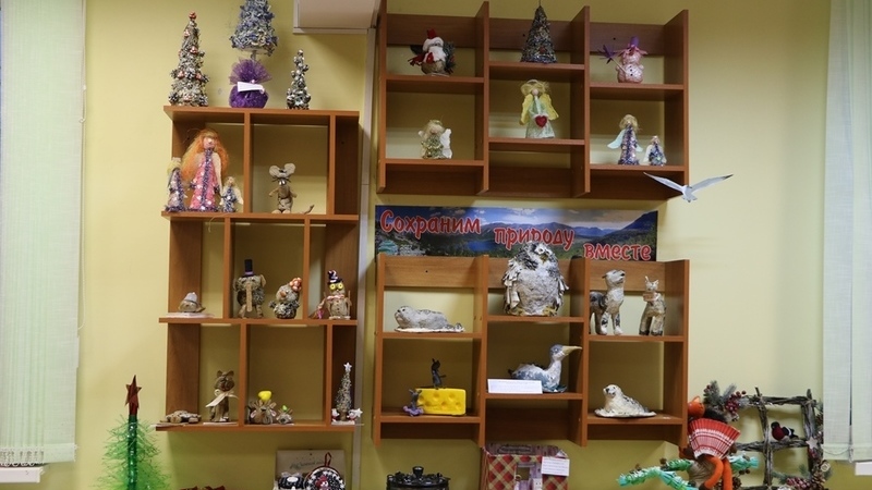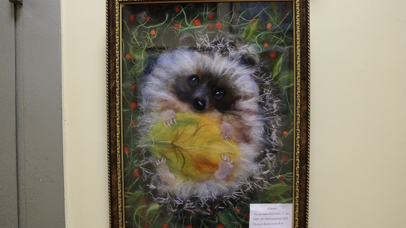 Это поделки и картины из природного и бросового материала, завораживающие объемные картины «Волки в зимнем лесу» и «Домик в лесу», мягкие и трогательные картины из шерсти: «Ежик», «Рыжий кот», «Золотая осень» и другие. А также флористические картины: «Жилище саамов», «Уж небо осенью дышало», «Птичья трель» и замечательные букеты цветов.