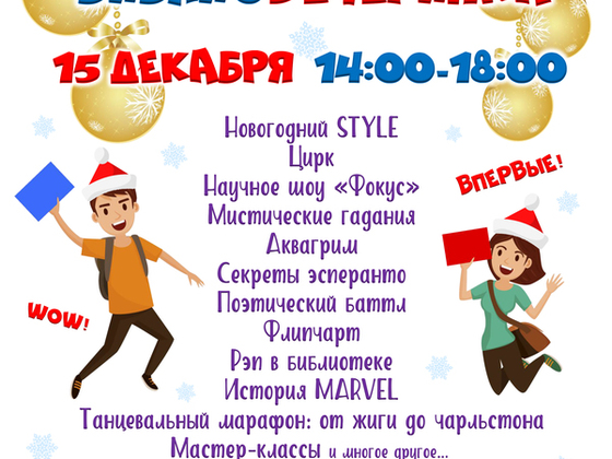 Вас ждет море музыки, танцев, необыкновенных встреч и открытий! Всем гостям мы гарантируем отличное предновогоднее настроение! Надеемся, что наш праздник придется по душе всем: от фанатов рэпа и мистических гаданий до поклонников современной поэзии и комиксов MARVEL. Гостей праздника ждет сюрприз – Новогодний Style от настоящего Деда Мороза и Снегурочек.