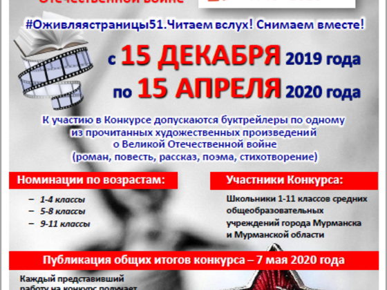 С 15 декабря 2019 года по 15 апреля 2020 года отдел электронных ресурсов проводит Областной конкурс буктрейлеров #Оживляястраницы51. Читаем вслух! Снимаем вместе!, посвященный 75-летию Победы в Великой Отечественной войне
