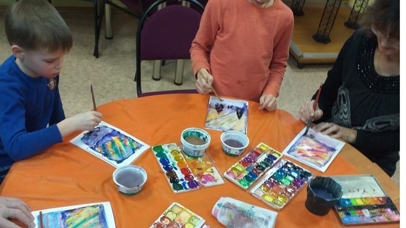 Зимняя тематика продолжилась рисованием акварельными красками. Ребята нарисовали открытки с северным сиянием. Мальчишки и девчонки изобразили разнообразные зимние пейзажи. В каждой открытке чувствовался морозный Крещенский день.