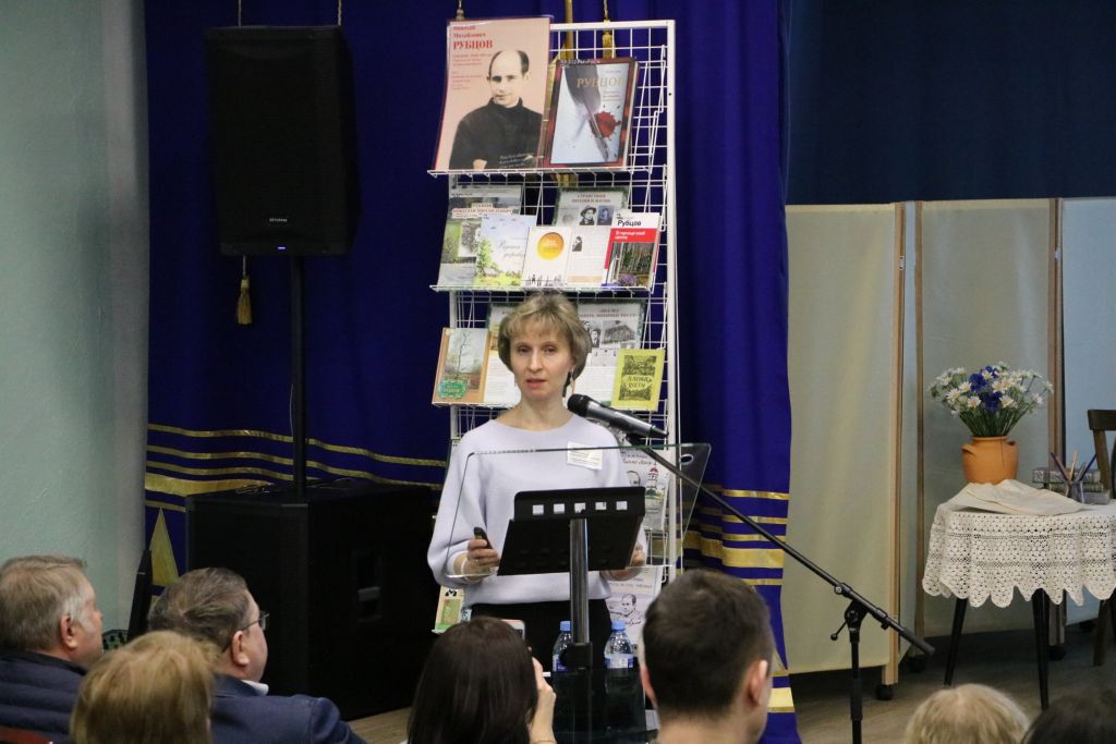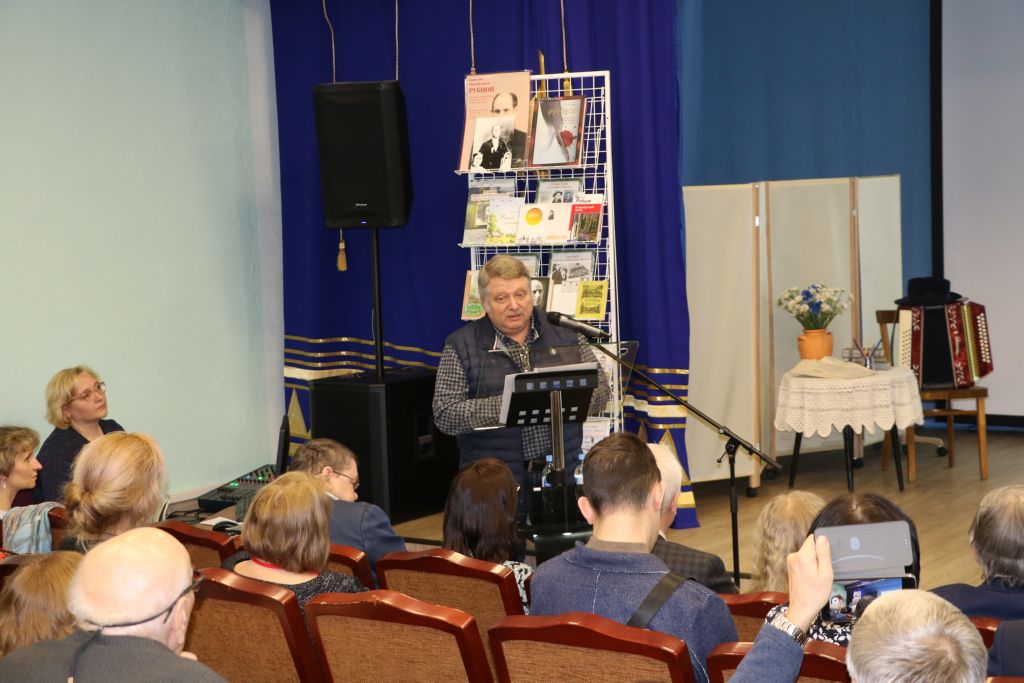 Далее ведущие предоставили слово гостю из Череповца, заместителю председателя Вологодского Союза писателей-краеведов, рубцововеду Вересову Леониду Николаевичу. Вересов Л. Н. познакомил слушателей со своей новой книгой «Михаил Андрианович Рубцов. Документальная история жизни отца поэта Николая Рубцова» и поделился подробностями своей работы над ней.
