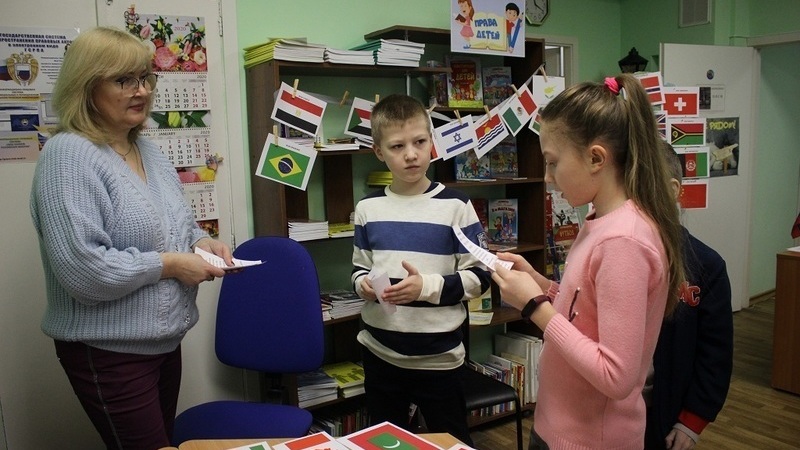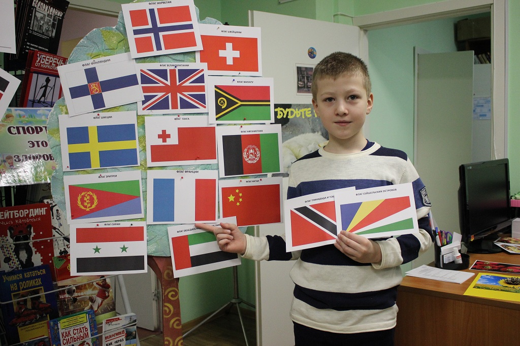 Участники мероприятия прослушали беседу о том, на какие группы делятся все флаги мира: красно-сине-белые, с диагональными полосами, с солнцем и другими кругами и так далее.