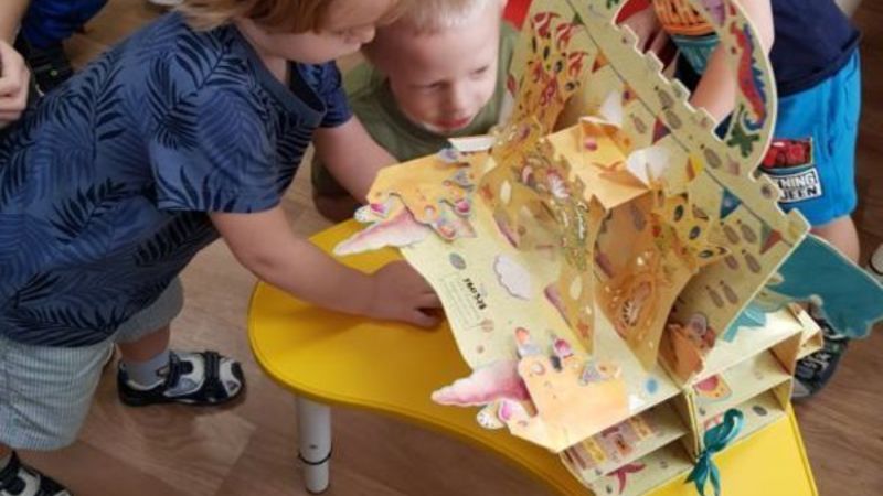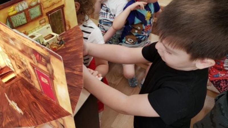 Увлекательно прошло литературное занятие «Откроем обложку – увидим театр!». Маленькие воспитанники познакомились с самыми удивительными интерактивными книгами: с панорамками, раскрывающимися конструкциями, книгами-театрами и каруселями. Ребята рассматривали объемные 3D-конструкции, играли в книжки-игры и превращались в разных героев. Дети поучаствовали в мини-спектакле «Три поросенка», увидели, как живет Баба-яга в книге-карусели, послушали историю из книги «Добрый медвежонок» и поиграли с этим медвежонком.
