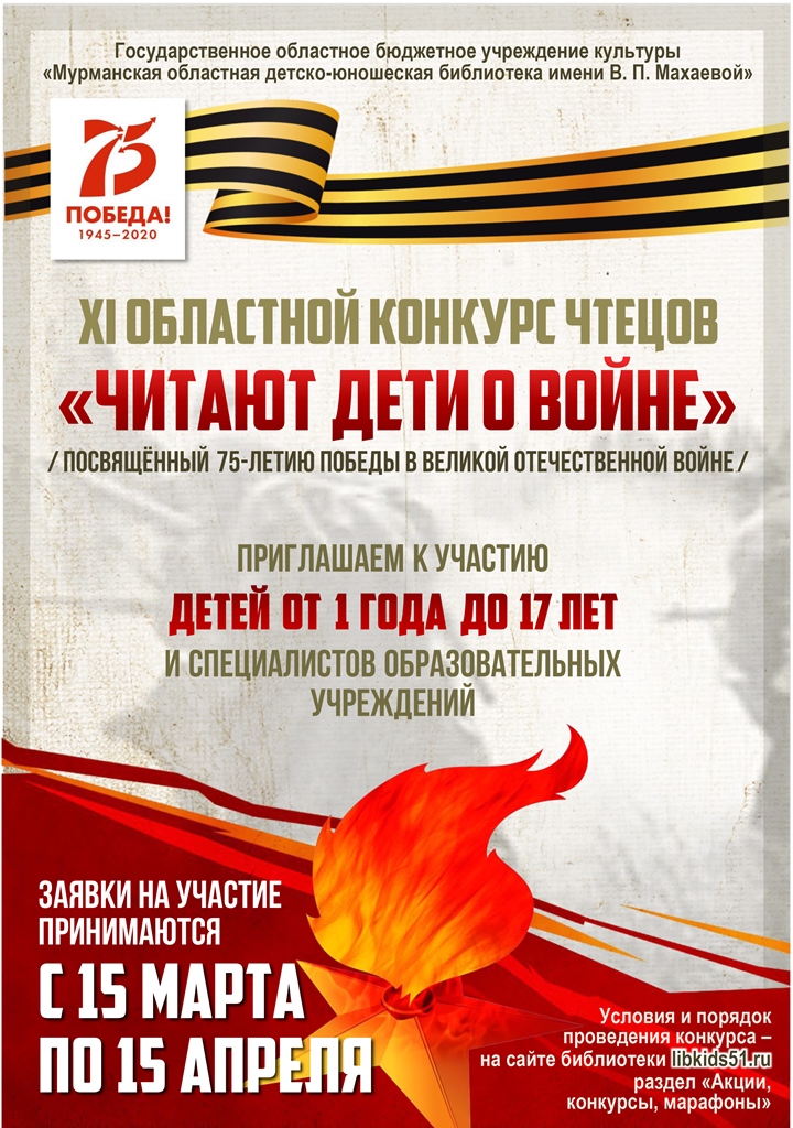 Мурманская областная детско-юношеская библиотека имени В. П. Махаевой приглашает принять участие в Областном конкурсе чтецов «Читают дети о войне» дошкольников, их родителей, детей школьного возраста до 17 лет включительно и специалистов образовательных учреждений.