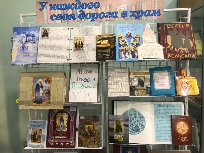 В отделе краеведческой литературы работала еще одна познавательная выставка «У каждого своя дорога в храм», на которой представлены книги из фонда отдела о православии на Мурмане, святых местах Кольской земли, Трифонов Печенгском монастыре и описания жития святых Кольской земли: прп. Трифона Печенгского, прп. Феодорита Кольского, прп. Варлааме Керетском. Сегодня особенно актуально обращение к проблеме возрождения интереса к умной, содержательной книге. Эти выставки смогут помочь людям выбрать правильные приоритеты в жизни.