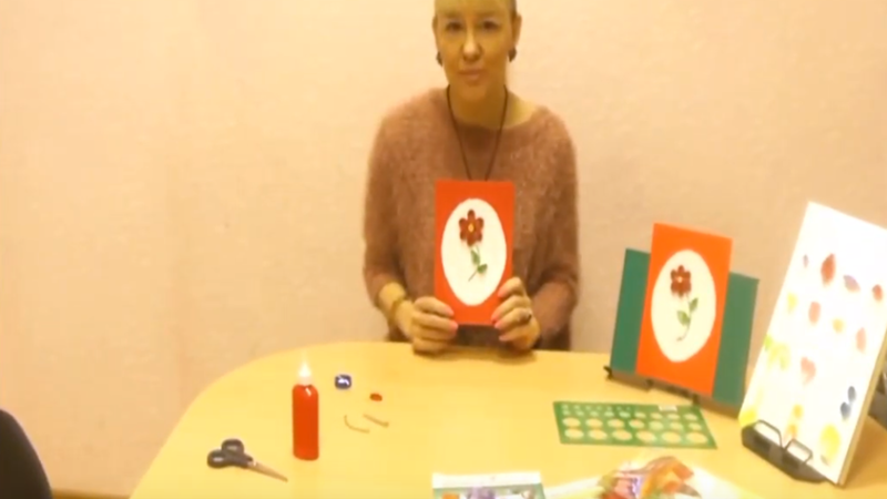 В творческой мастерской «Волшебный квиллинг» проходит мастер-класс по изготовлению открытки с красным цветком.