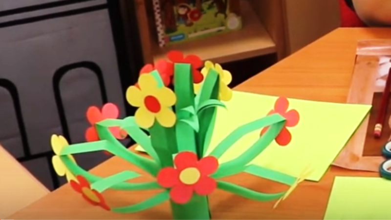 Сегодня дети научатся делать яркие корзиночки-букеты из разноцветных цветочков. Для работы понадобятся: цветная бумага, клей, ножницы, карандаш и линейка.