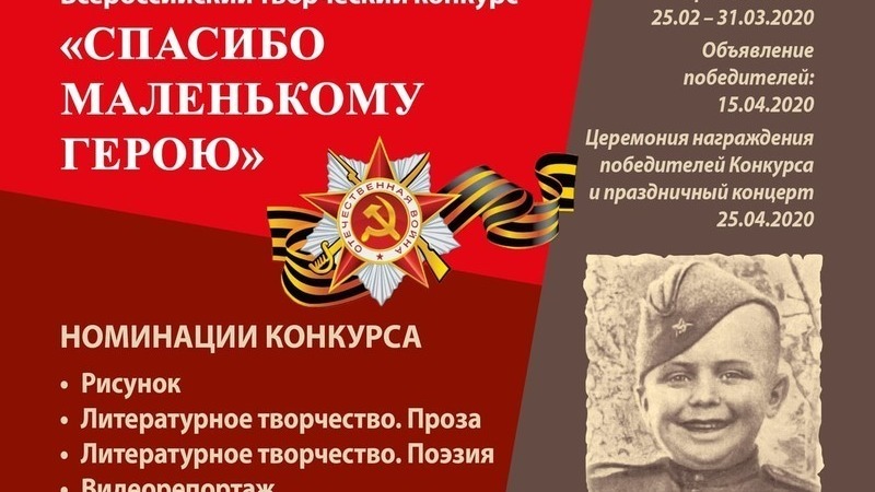 25 февраля 2020 года стартовал прием заявок на Всероссийский творческий конкурс «Спасибо маленькому герою», который проводит фонд Оксаны Федоровой «Спешите делать добро!» в сотрудничестве с Музеем Победы, Почтой России, Российской государственной детской библиотекой (РГДБ) и Национальной родительской ассоциацией.