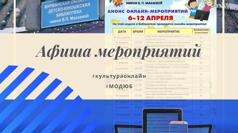 Дорогие читатели областной детско-юношеской библиотеки имени В. П. Махаевой. Предлагаем ознакомиться с программой онлайн-мероприятий с 6 по 12 апреля, которые будут размещены на сайте