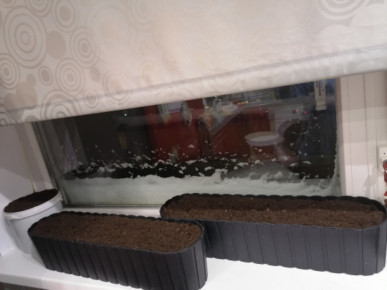 На подоконнике кухни посадила огородик, который уже дал первые ростки.