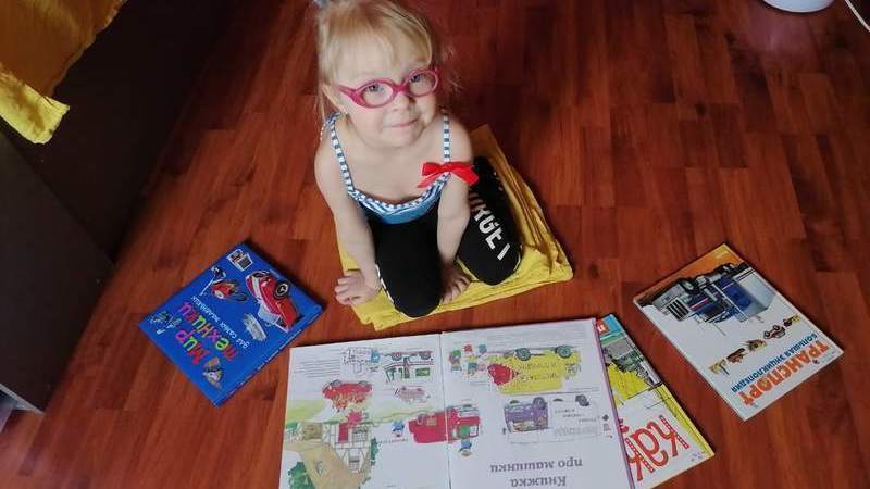 Читает со всеми членами семьи и просматривает много книг. На данный момент про технику, весь транспорт, какой существует (воздушный, водный, наземный и т.д.). Успели до самоизоляции взять книги из библиотек города (МОДЮБ и МБУК "Центральная детская библиотека города Мурманска", Библиотека-филиал № 5 «Матроскин»).
