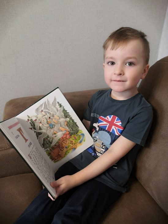 «Меня зовут Слава Макаров. Мне 4 года. В моей комнате очень много книг со сказками, рассказами и стихотворениями. Я очень люблю, когда мне мама каждый вечер перед сном их читает. И самая любимая – "Чудо чудное" с русскими сказками.»