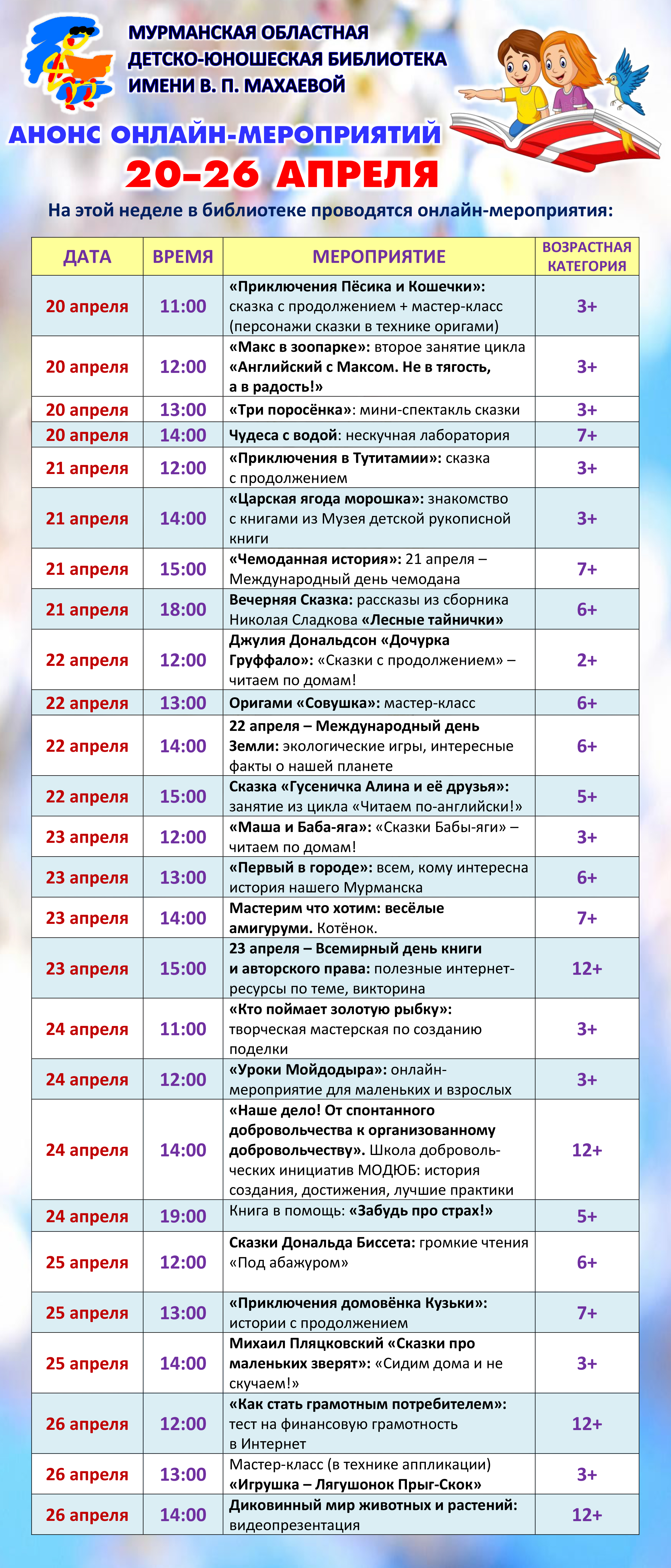 Дорогие читатели областной детско-юношеской библиотеки имени В. П. Махаевой. Предлагаем ознакомиться с программой онлайн-мероприятий с 20 по 26 апреля, которые будут размещены на сайте