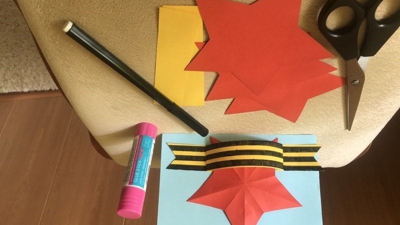 Они покажут и расскажут, как, при помощи техники бумажной пластики и рисования фломастерами, можно сделать красивую композицию, на которой будут представлены символы Победы: объёмная красная звезда и Георгиевская ленточка.