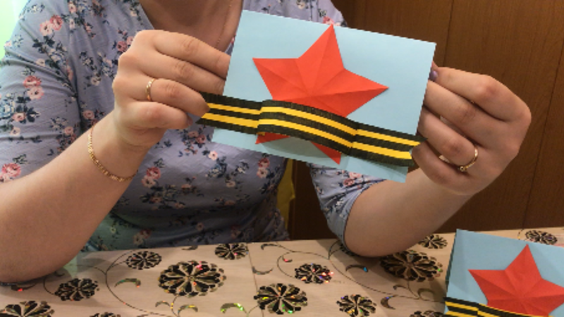 Они показывают и рассказывают, как, при помощи техники бумажной пластики и рисования фломастерами, можно сделать красивую композицию, на которой представлены символы Победы: объёмная красная звезда и Георгиевская ленточка.