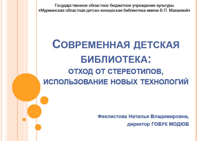 Какой должна быть сегодня библиотека для детей и юношества? К чему стремиться и какие актуальные формы работы использовать? На эти вопросы постаралась ответить в своем выступлении «Современная детская библиотека: наличие профессиональных находок, отход от стереотипов, использование новых технологий» директор Мурманской областной детско-юношеской библиотеки имени В. П. Махаевой» Наталья Владимировна Феклистова. Она представила новые форматы выставочной деятельности и работы с читателями.