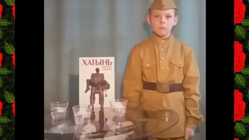 Он декламирует отрывок из поэмы Фазу Алиевой "Хатынь".