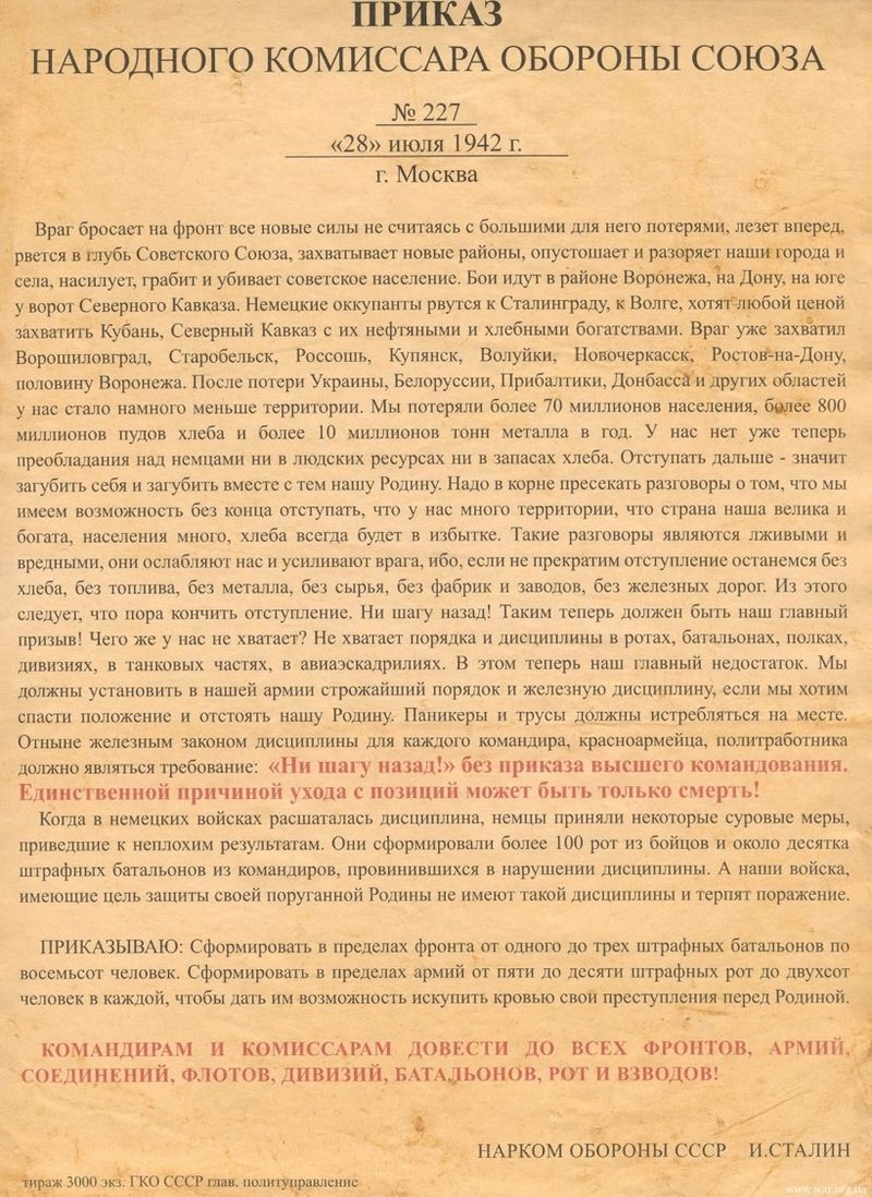 Официальное название приказа – «О мерах по укреплению дисциплины и порядка в Красной Армии и запрещении самовольного отхода с боевых позиций». Но в народе он, конечно, был более известен по ключевой строчке – «Ни шагу назад!».