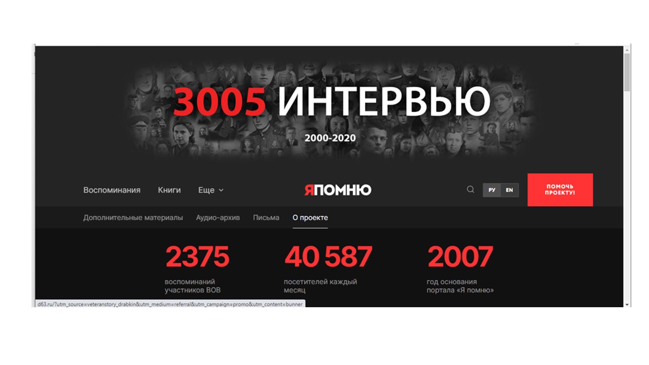 Это портал с воспоминаниями участников ВОВ. Создан при поддержке Федерального агентства по печати и массовым коммуникациям. Цель проекта: сохранить воспоминания свидетелей событий Великой Отечественной войны как первоисточник информации для будущих поколений. Сайт для тех, кто хочет постигать историю через рассказы реальных людей. Там вы найдёте письменные и аудио интервью, копии писем с фронта и фотографии военных лет. Воспоминания участников ВОВ поделены по родам войск, к которым они относились: лётчики, артиллеристы, медики, сапёры, танкисты и так далее.