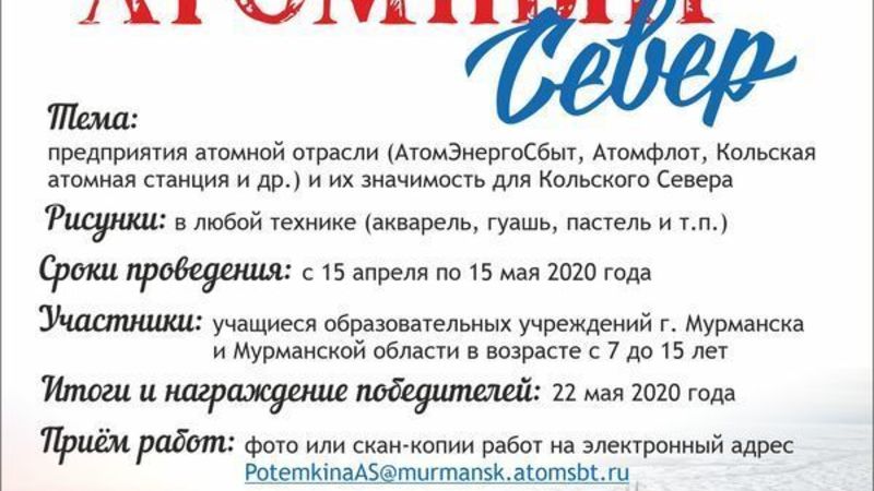 Участникам предлагается выполнить рисунок в любой технике (акварель, гуашь, пастель и т.п.), раскрыть тему предприятий атомной отрасли («АтомЭнергоСбыт», «Атомфлот», Кольская атомная станция и др.) и их значимости для Кольского Севера.