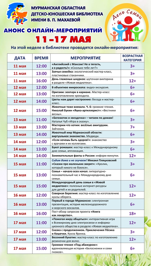 Дорогие читатели областной детско-юношеской библиотеки имени В. П. Махаевой. Предлагаем ознакомиться с программой онлайн-мероприятий с 11 по 17 мая, которые будут размещены на сайте
