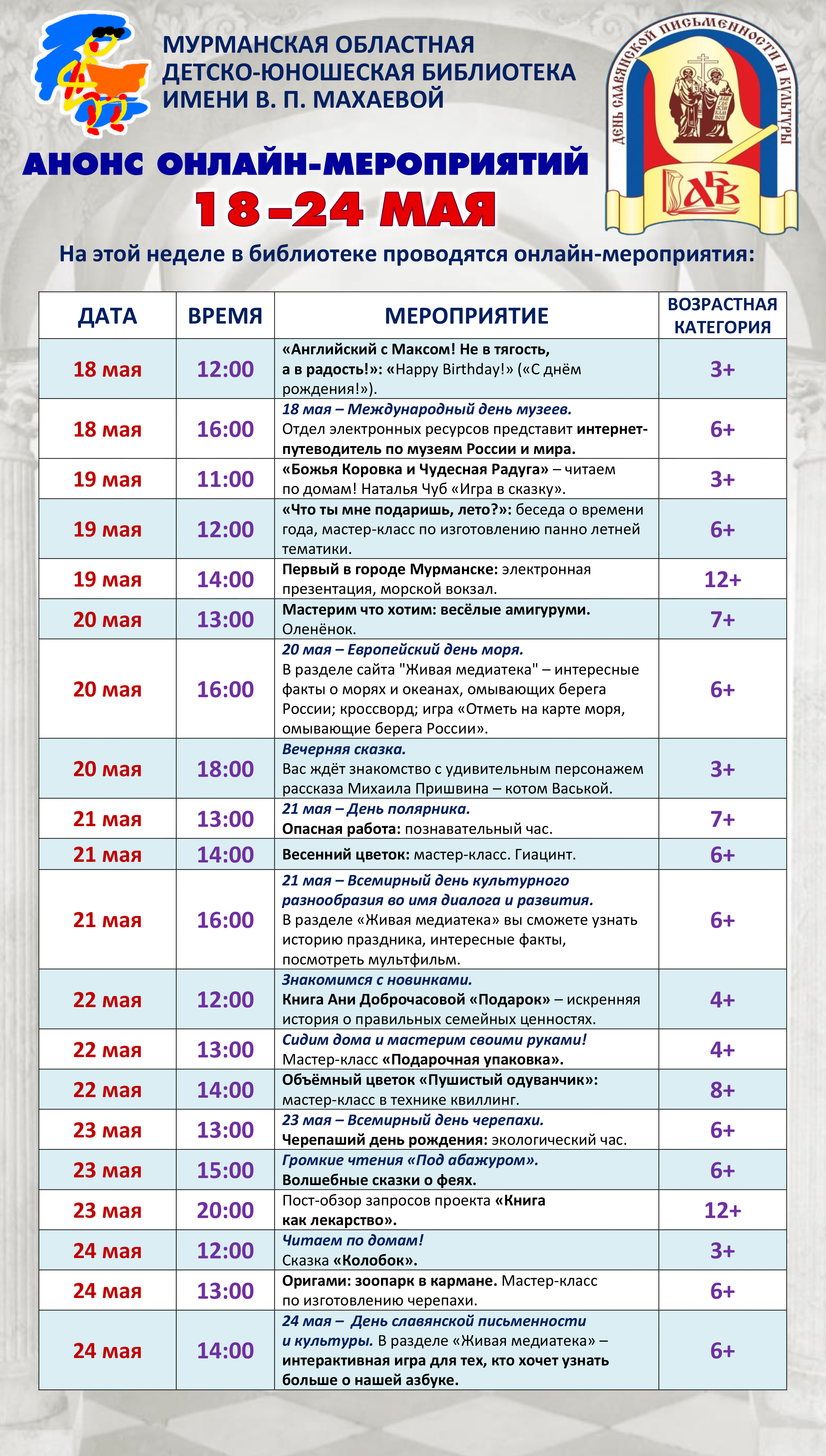 Дорогие читатели областной детско-юношеской библиотеки имени В. П. Махаевой. Предлагаем ознакомиться с программой онлайн-мероприятий с 18 по 24 мая, которые будут размещены на сайте