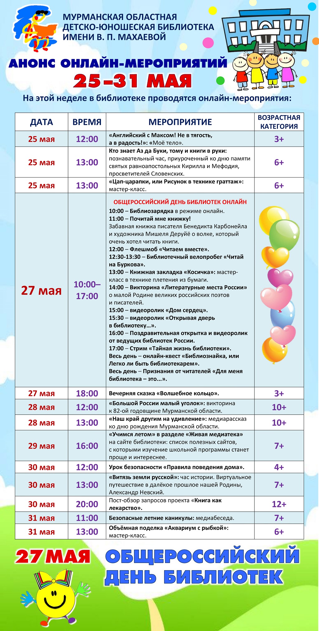 Дорогие читатели Областной детско-юношеской библиотеки имени В. П. Махаевой. Предлагаем ознакомиться с программой онлайн-мероприятий с 25 апреля по 31 мая, которые будут размещены на сайте
