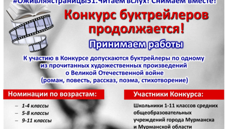 Отдел электронных ресурсов продолжает прием работ на Областной конкурс буктрейлеров #Оживляястраницы51. Читаем вслух! Снимаем вместе!, посвященный 75-летию Победы в Великой Отечественной войне