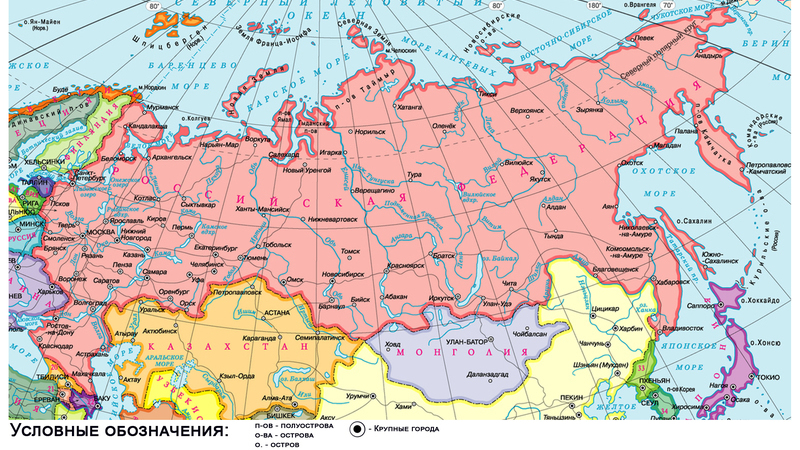 Наша страна самая большая в мире. На карте она обозначена розовым цветом и называется Российской Федерацией.