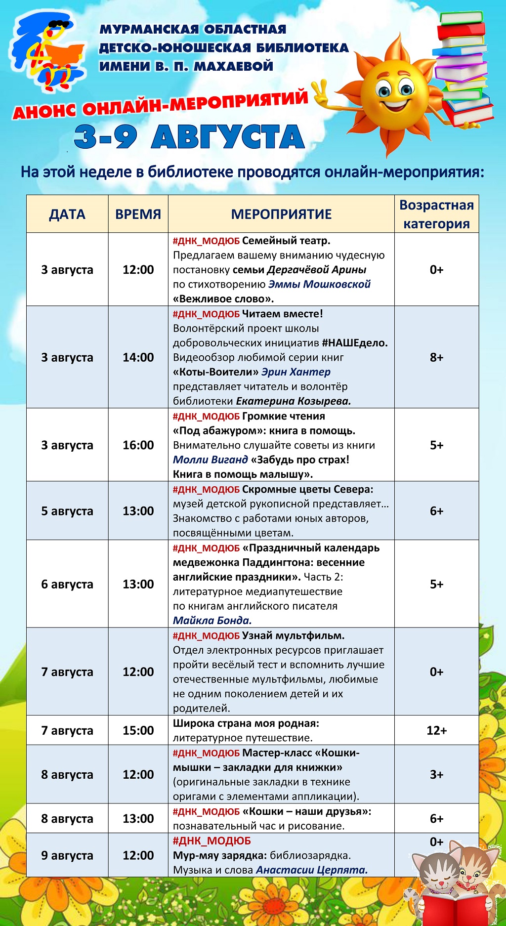 Дорогие читатели Областной детско-юношеской библиотеки имени В. П. Махаевой. Предлагаем ознакомиться с программой онлайн-мероприятий с 3 по 9 августа, которые будут размещены на сайте во вкладке «Новости»
